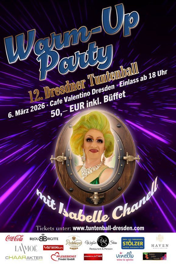 Die Warm Up Party zum 12. Dresdner Tuntenball findet statt am Freitag, den 06.03.2026 ab 18:00 Uhr im Valentino.